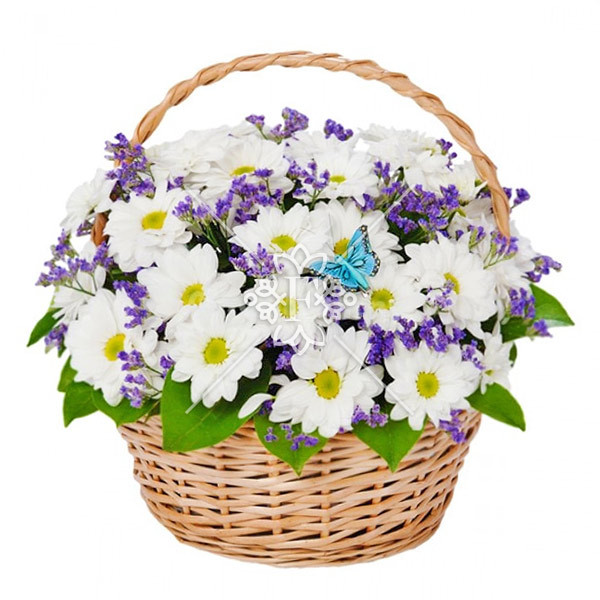 хризантема кустовая ромашковидня белая – 9 шт. (на фото), лимониум фиолетовый, зелень декоративная, оазис, корзина малая, декор.